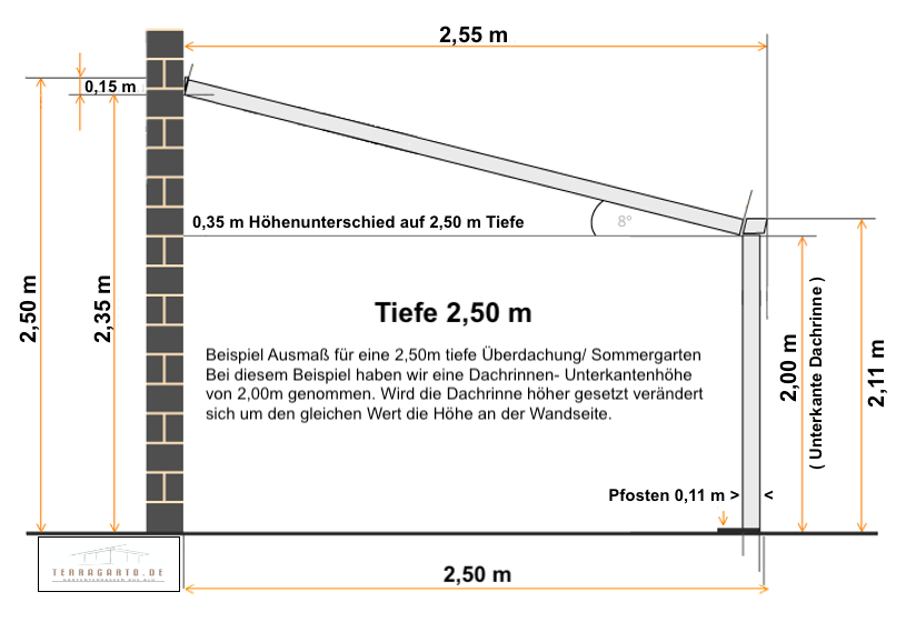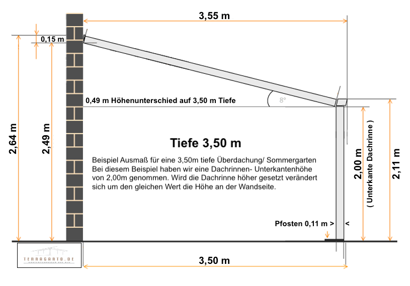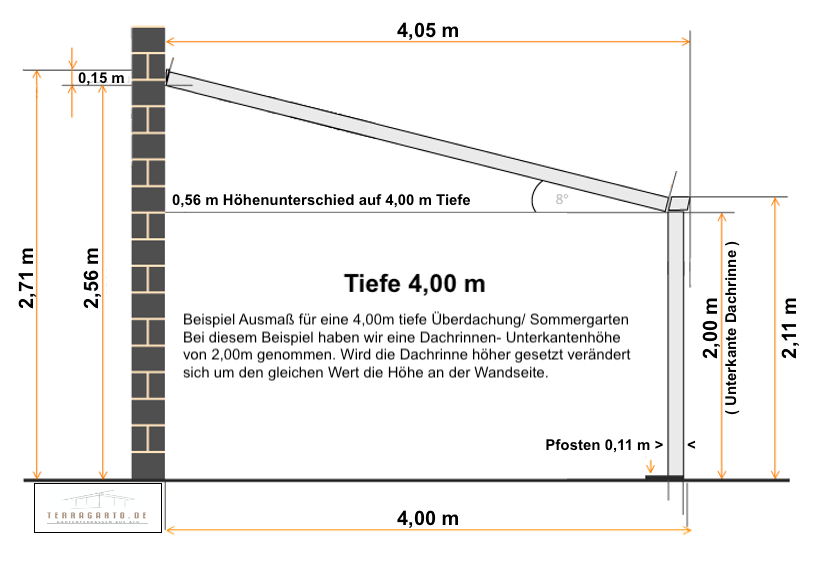 Haben Sie ein Individuelles Tiefenmaß wie zum Beispiel 3,75 m rechnen Sie diese Tiefe immer X 14 cm/pro m Gefälle = 3,75 x 14 ergibt 0,52 m Höhenunterschied von Unterkante Dachrinne zu Unterkante Wandprofil.