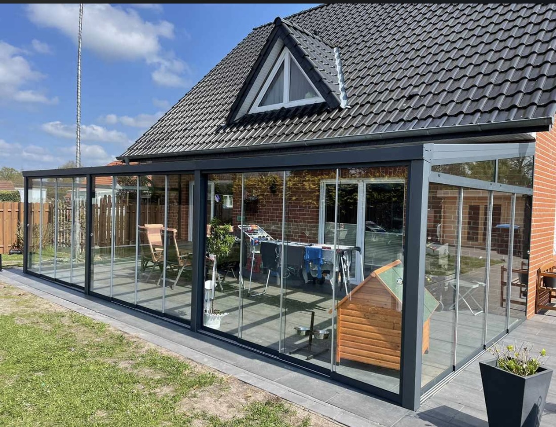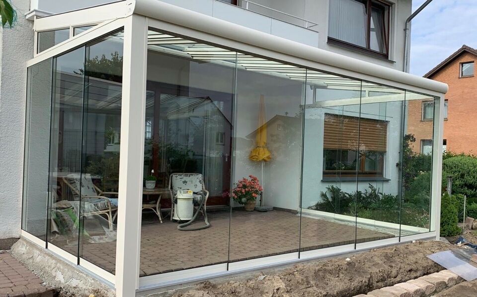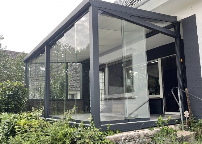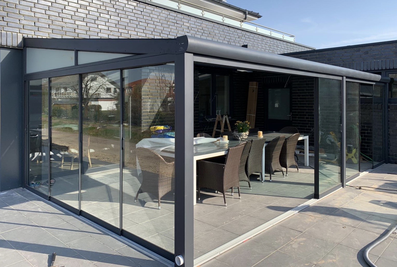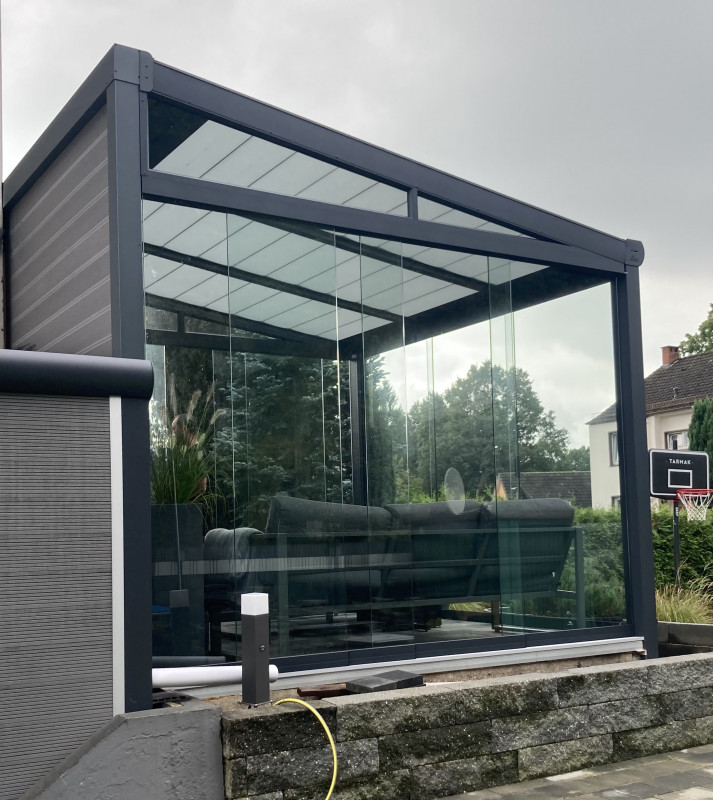 Machen Sie aus Ihrer offenen Überdachung einen Sommergarten durch eine unserer Glasschiebeanlagen. Die Wunschhöhe wählen Sie unter Höhe Dachrinne.